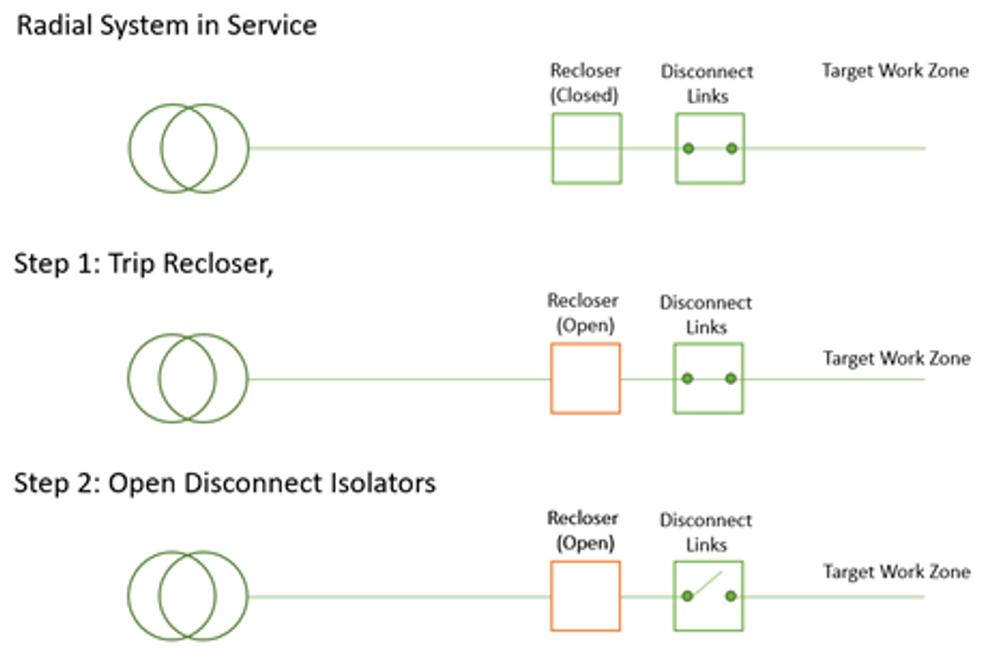 A critical risk is the operation of a disconnect link without the recloser being in the open position interrupting the current, or the accidental closure of the recloser while some phase disconnectors remain open. Using the mechanical lockout feature mitigates the risk of external sources from accidentally creating this scenario. Figure 1 highlights an example isolation sequence, and where risk of re-energisation is considered high, Step one can include either an open by mechanical lockout, or the application of mechanical lockout once a trip has been issued electronically.