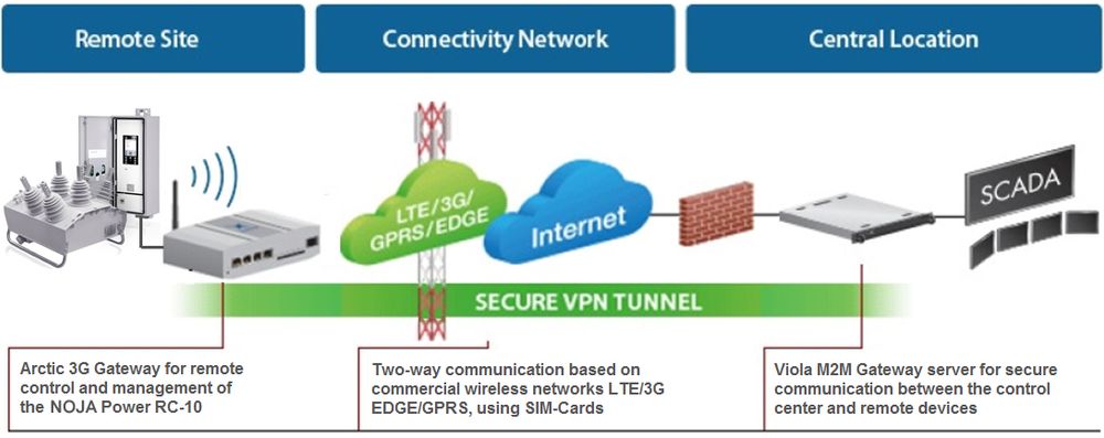 PTI used technology from specialist network communication equipment company Viola Systems Ltd of Finland to link to the cellular network (PTI S.A. represents Viola Systems in Colombia.) A key element of Viola Systems’ technology is the Arctic Gateway router, a smart communication device which is installed at the remote distribution automation site enabling connection to the cellular network. The routers are connected to the cellphone network and then through the Internet using Virtual Private Networks (VPN) to the Viola Systems M2M server installed in the client’s control centre.